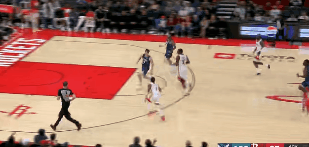 火箭一个快攻机会,克弩一防二延迟火箭反击,拖到队友回防,自己竭力挡了一个上篮。